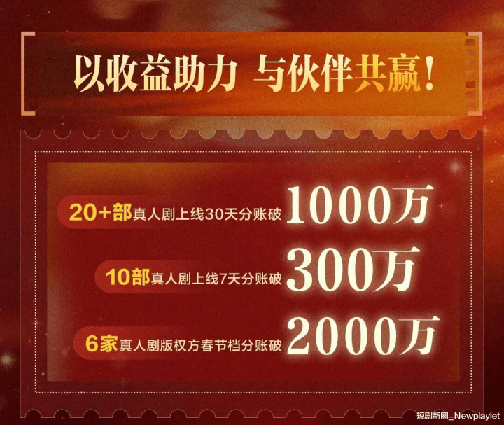 数据显示:超20部真人剧上线30天分账突破1000万元,10部作品上线仅7天分账便破300万元,6家真人剧版权方春节档整体分账超2000万元,创作者与出品方均实现了可观的收益回报。